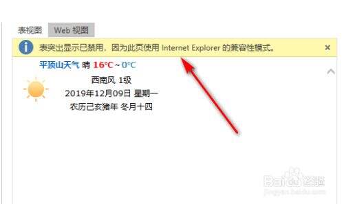 使用Excel 2019时导入网页数据时,提示“表突出显示已禁用,因此页使用Internet Explorer的兼容性模式”。无法将内容导入到表中。