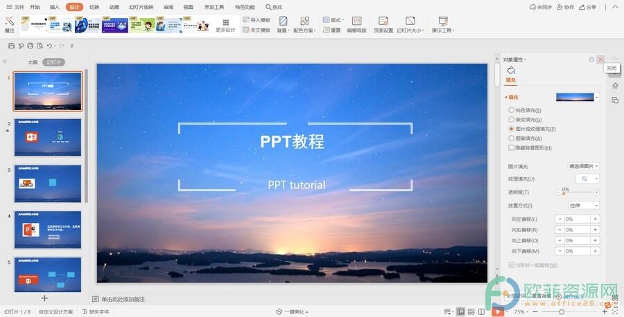 PPT演示文稿,点击“设计”选项卡,点击“背景”,点击之后可以看到界面右侧多出了一个“对象属性”窗口,我我们点击勾选其中的“隐藏背景图形”;