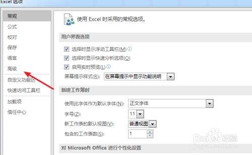 打开EXCEL选项窗口,点击“高级”进入高级设置界面。