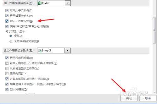 勾选上“显示工作表标签”,点击“确定”按钮完成设置。