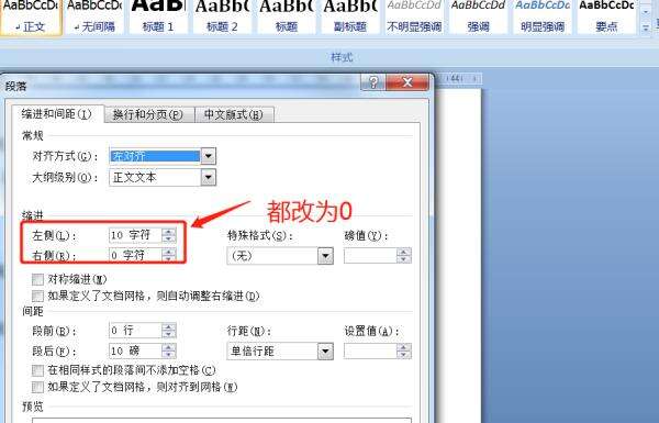 3、在对话框中找到 “缩进”,把“左缩进”“右缩进”后面的内容改为零,关闭对话框后就可以输入内容了。