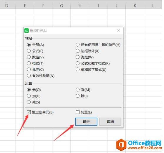 这时会出现“选择性粘贴”工具框,我们将“跳过空单元”勾选,并点击确定,如图: