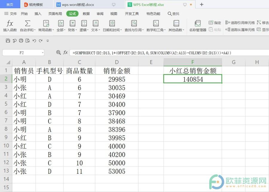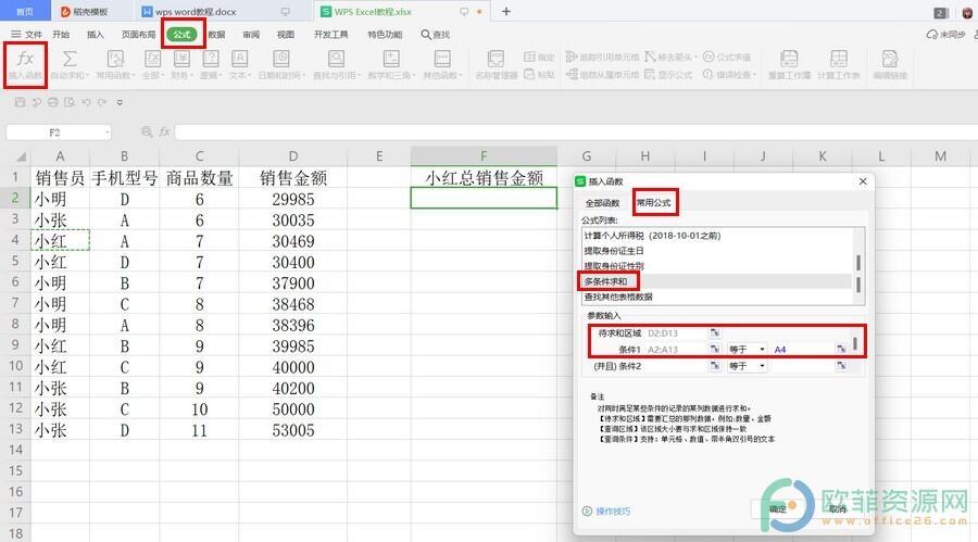第一步:打开WPS,将鼠标定位到需要输入结果的单元格,点击节目上方的“公式”选项卡,接着找到并点击“插入函数”,接着在打开的“插入函数”窗口,点击“常用公式”,接着找到并点击“多条件求和”,在“带球和区域”处,,选中需要进行求和的数据所在的数据列,比如我们这里选中D2:D13区域,“条件”处,选中条件所在的数据区域,比如我们这里选中A2:A13区域,中间点击选择“等于”,右侧可以任意点击一个条件所在的单元格,比如我们想要计算的是小红的总销售金额,我们就可以点击任意一个单元格是“小红”的单元格,然后点击“确定”;