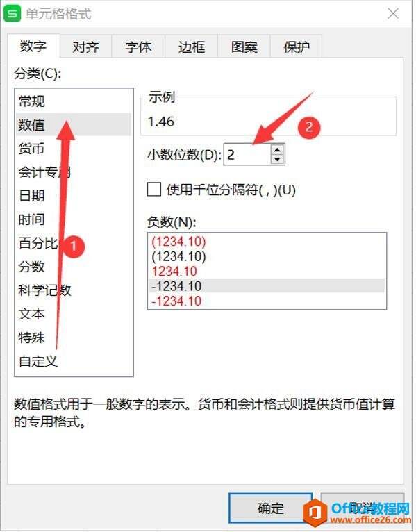 然后点击数值,在右侧我们可以选择小数的位数或者是类型,设置完成之后点击确定: