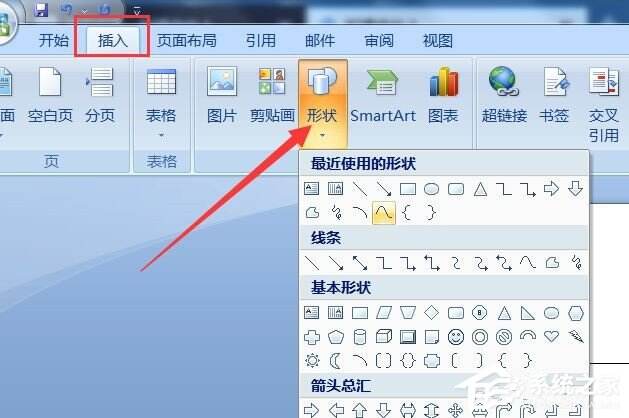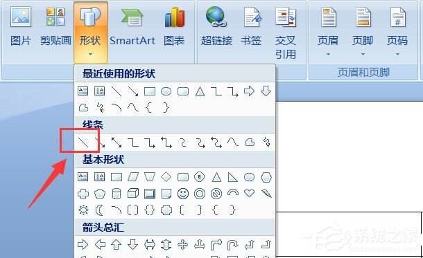 2、在下拉的选择框中找到“线条”然后选中第一个图形直线。