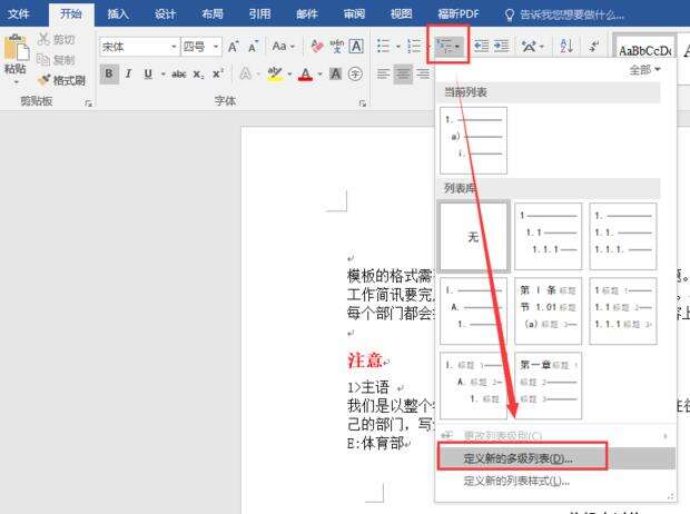 再在【多级列表】选项中,点击【定义新的多级列表】选项。
