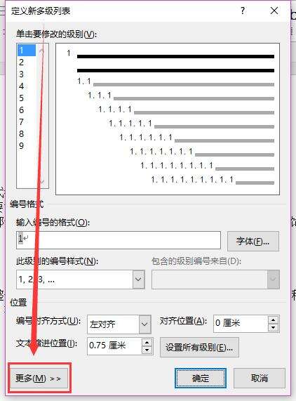 在弹出的【定义新多级列表】窗口中,点击【更多】按钮。