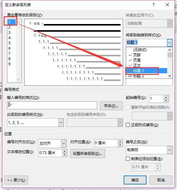 在弹出的窗口中,【点击要修改的级别】为1,第一级列表对应的【将级别链接到样式】下拉选择【标题1】。