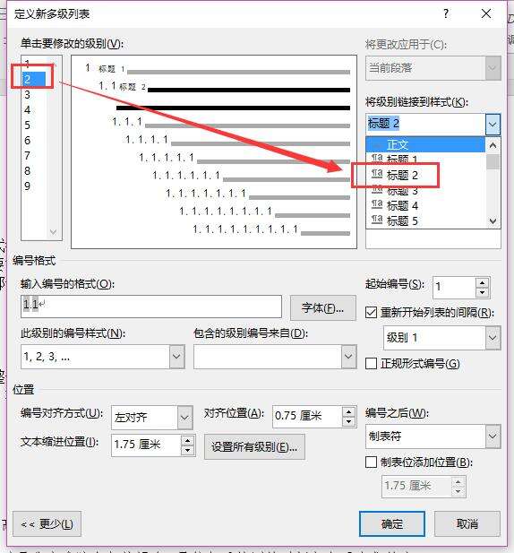 第二级列表对应的将级别链接到样式下拉选择【标题2】,想设置多少级就按照这样依次类推即可。
