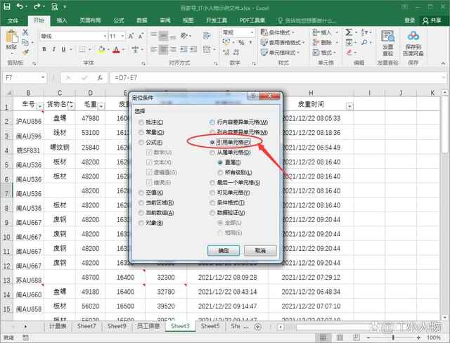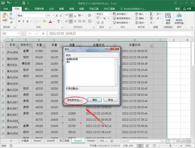 2、全部选中整个表格数据,按F5键,打开“定位”对话框,点击【定位条件】