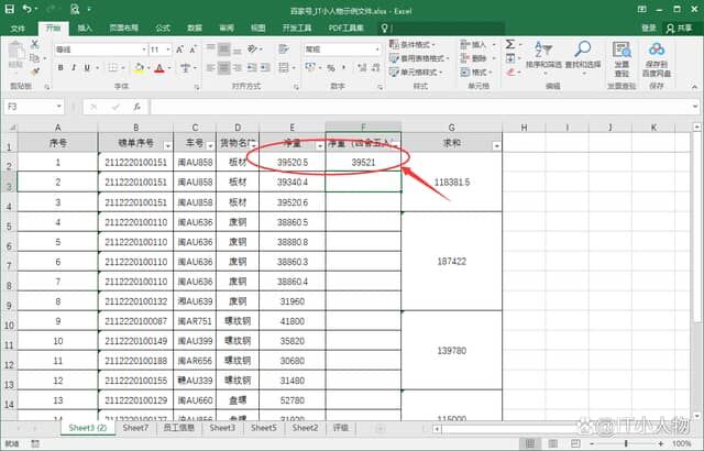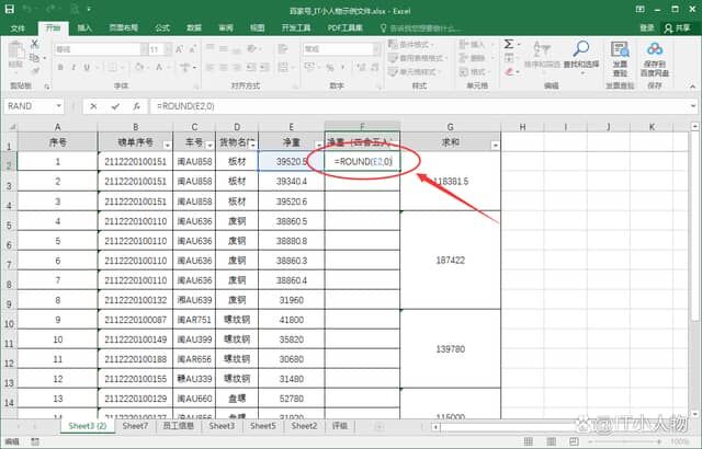 3、“四舍五入”使用的函数是“ROUND()”,在第一个单元格中输入公式“=ROUND(e2,0)”,函数中第一个是指原数据,第二个参数指得是小数位保留多少位;