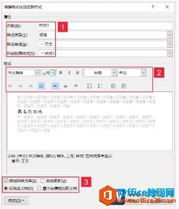 步骤3、打开“根据格式化创建新样式”对话框,用户可以在“属性”窗格内对样式名称、类型、基准等进行设置,还可以在“格式”窗格内对字体、字号、字形等进行设置。设置完成后,单击勾选“添加到样式库”前的复选框,单击“确定”按钮,如图3所示。