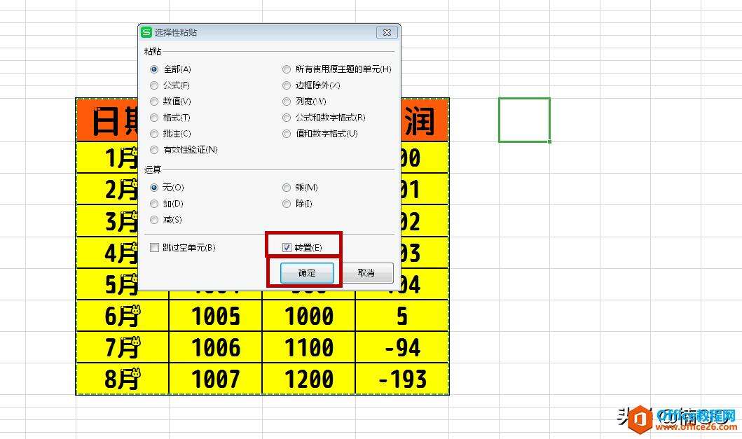 接着,再在空白单元格中单击右键,选择“选择性粘贴”选项,在弹出的窗口中只需将“转置”一项勾选,点击“确认”就OK啦~