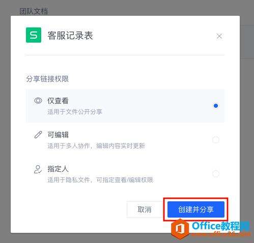 (2)这时会弹出一个文档权限设置页面,有三个选项:「仅查看」、「可编辑」、「指定人」,你可以根据需要选择权限类型,然后点击「创建并分享」: