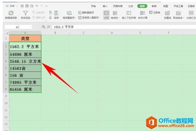 首先我们看到如下表格,我们以此图表为一个简单的例子,将数字与单位分隔开来。选中数据后,单击工具栏数据下的分列。