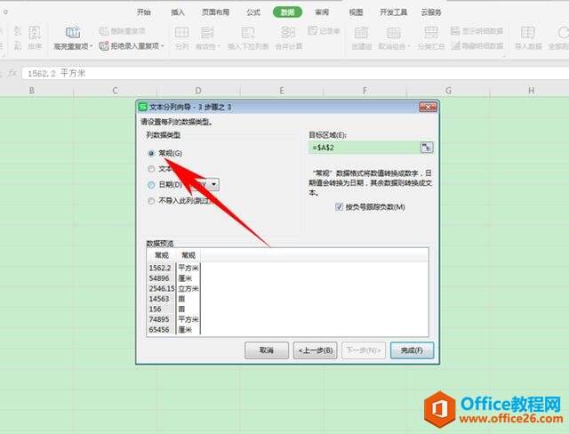 在列数据类型里我们可以选择常规、文本、日期类型,根据我们的需要可以自行选择,单击完成即可。