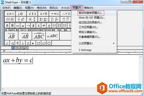 2.在这个编辑界面中,用鼠标点击MathType菜单中的“预置”——“剪切和复制预置”。