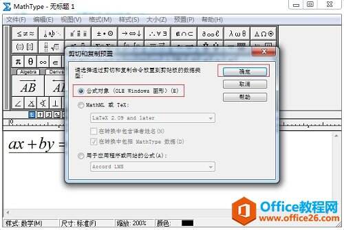 3.随后会弹出一个窗口,在这个窗口中,此时你会看到你的界面里面选择的是第二项,即“MathML或Tex”前面的复选框是被勾选上的,此时要取消这一个选项,直接点击“公式对象”这个选项,最后确定。你再尝试把MathType里面的公式复制粘贴到Word里面就会发现公式已经显示成我们想要的样式了。