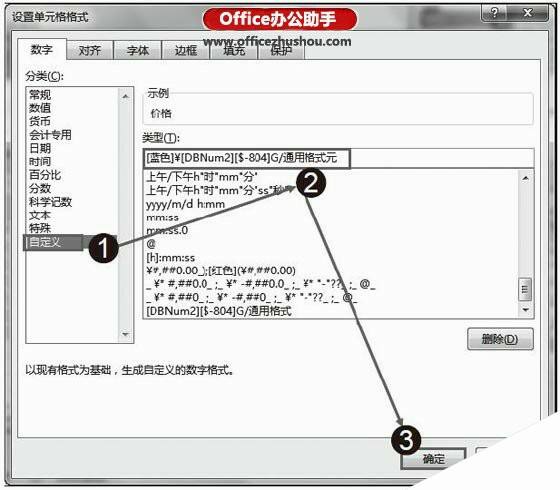 步骤2:打开“设置单元格格式”对话框,在“分类”列表中选择“自定义”选项,在右侧的“类型”文本框中的格式代码后面添加单位“元”字,在前面添加人民币符号“¥”和颜色代码“[蓝色]”,设置完成后单击“确定”按钮,如图2所示。