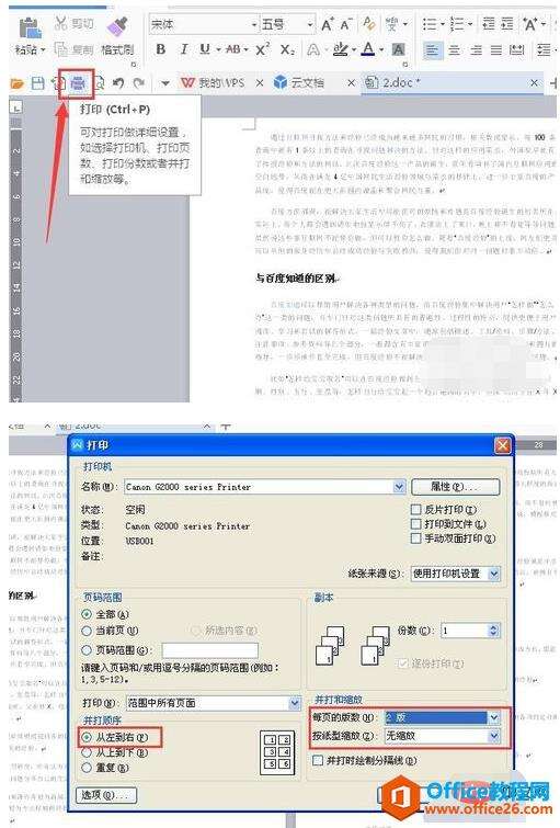 直接进入【打印】。打印设置中有一个功能,就是【并打和缩放】,其中每页打印的版式,这里选择【2版】。纸型缩放选择【无缩放】。并打顺序选择【从左到右】。
