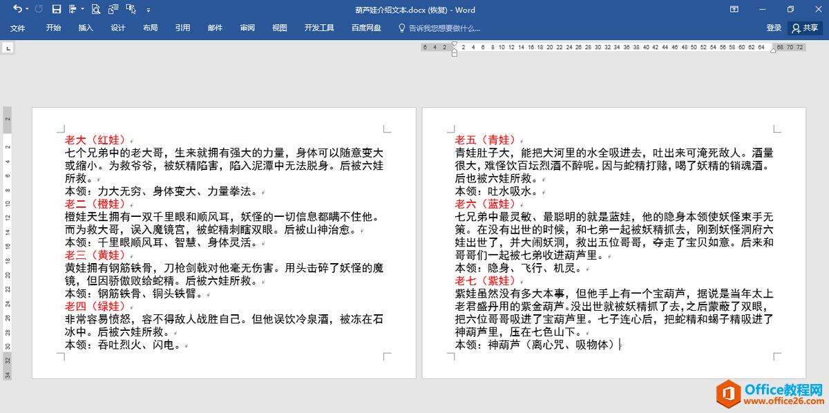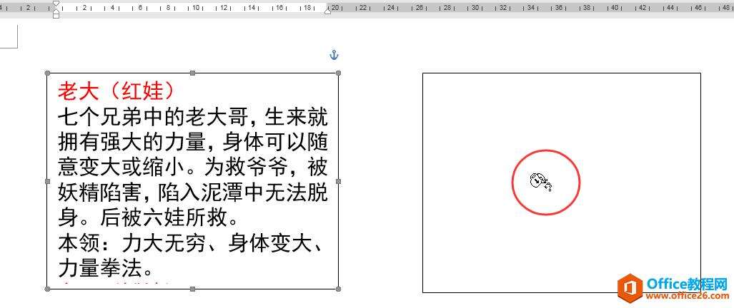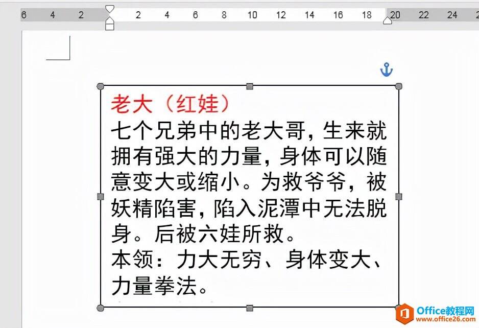 3.选中第一个文本框,适当调整文本的字号和段落间距,使第一个葫芦娃的介绍文本内容与文本框的大小相匹配。