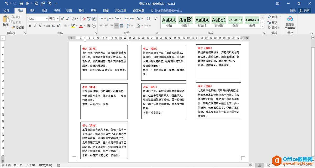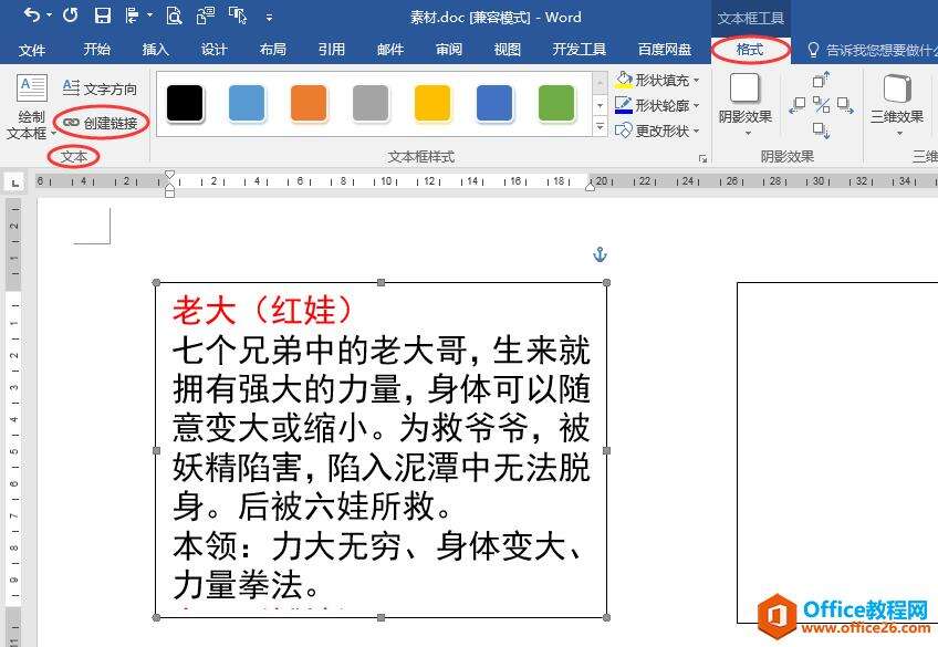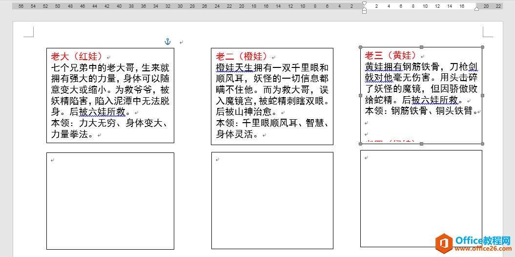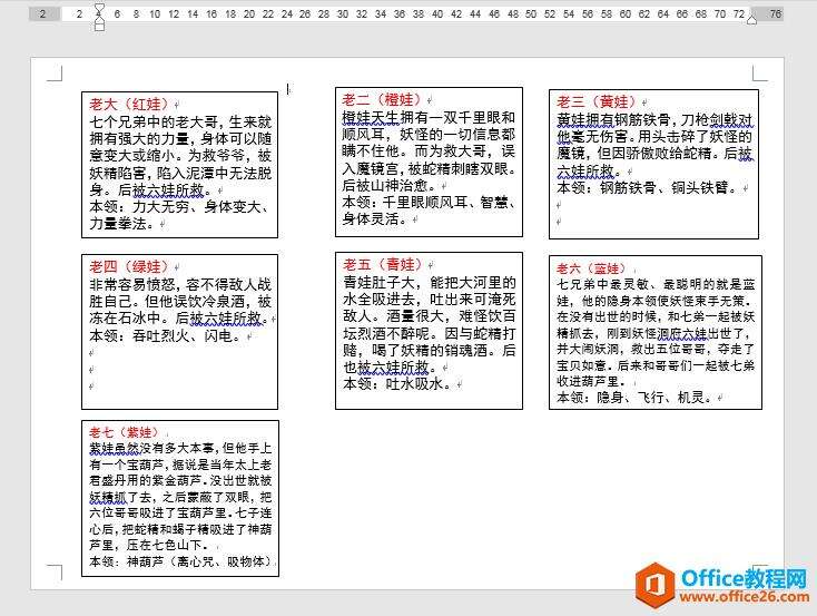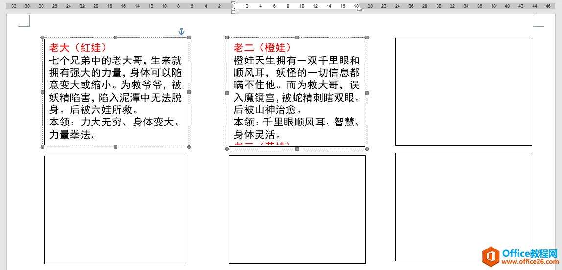 7.按同样的方法为第三个、第四个、第五个、第六个文本框创建链接,将剩余葫芦娃的信息分别显示在对应的文本框中。