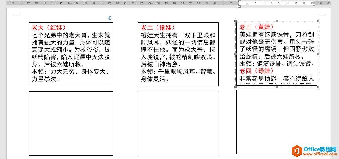 此时我们会发现第三个文本框中多显示了一部分第四个葫芦娃的信息。我们可以通过敲击键盘上的回车键在第三个葫芦娃和第四个葫芦娃之间添加空行,将第四个葫芦娃的文本信息往下压。(这里也可以尝试步骤3中提到的方法。)
