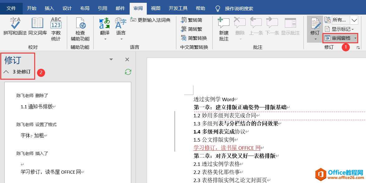 “审阅>审阅窗格”后会出现所有修改内容的列表,在列表中会列出共有几种修改。