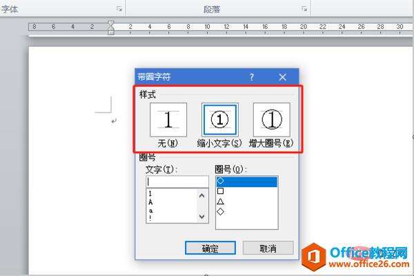 2、点击“字”图标,弹出带圈符号设置框,样式有三种可选择,根据需要选择则可,这里示例选择第二个,带圈缩小文字;