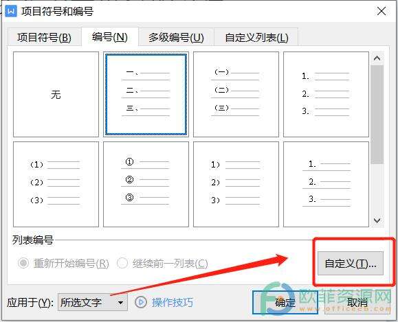 3.会弹出来的下拉框中用户选择底部的自定义编号选项来打开项目符号和编号窗口