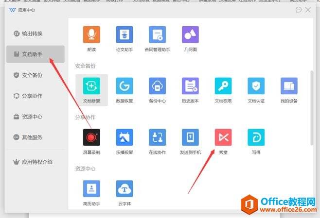 在应用中心的对话框中点击文档助手,然后在右边的分享协作中点击秀堂: