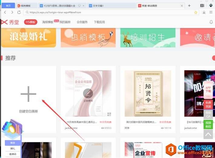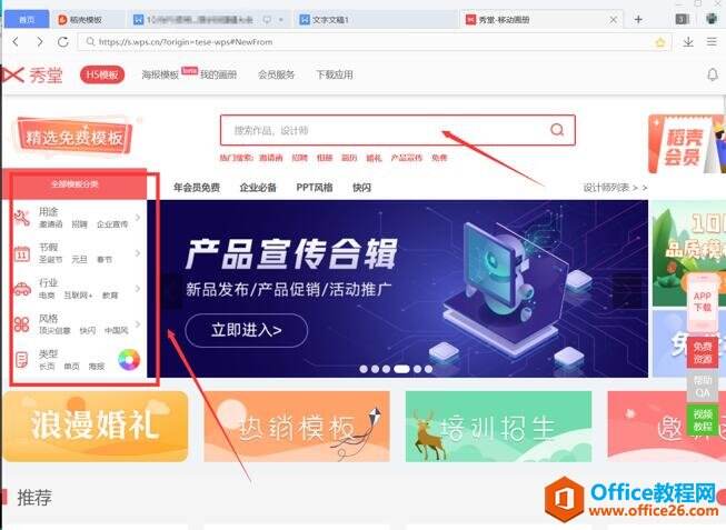 这时候就出来秀堂的界面,搜索框中可以搜索关键词,左侧也可以寻找模板: