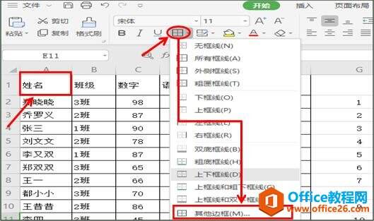 首先,我们把光标移到姓名单元格中,然后选择开始菜单栏下的边框按钮,选择下拉框中的其它边框,如下图所示: