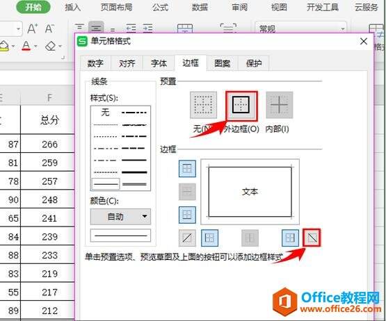 系统出弹出一个对话框,然后我们选择外边框,然后再选择边框样式右边的最后一个,如下图所示: