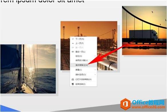 单击幻灯片放映,在放映的幻灯片当中单击右键选择演讲者备注。