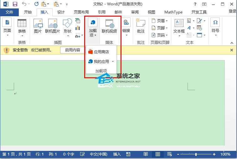2、点击 插入 选项卡,找到 加载项,这时的加载项 可能是彩色的(可使用状态)或者灰色的(不可使用状态)。那么很多朋友不太明白为什么会出现灰色的,也就是无法使用的状态呢。