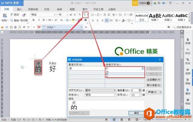 此外,WPS 文字在“拼音指南”中比Word还多了一个中文适用的声调功能,这个也是非常实用的。比如,我们有些古文中某些字的读音,与现代汉语不一样的,就需要手工调整。如下图演示:
