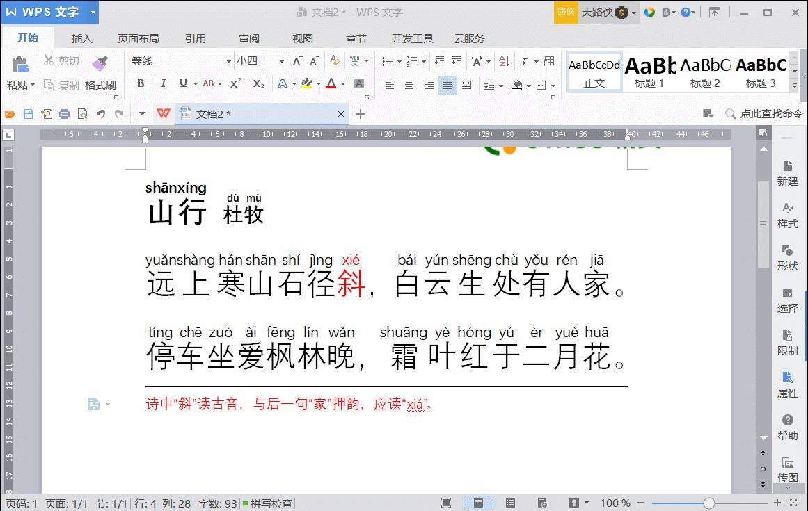 图中,以杜牧诗歌《山行》为例,对古音“斜”字进行了拼音修改。在拼音指南中没有“xiá”的读音,但是我们通过“声调”工具,可以修改成我们需要的拼音。