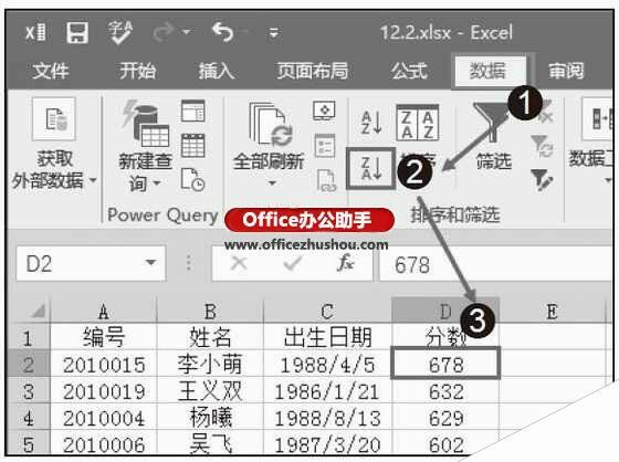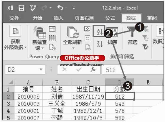 步骤2:将光标定位在“分数”列任意单元格中,在“数据”菜单“排序和筛选”选项组中单击“升序”按钮。可以看到整列数据按分数从低到高排列,最低分数为“512”,如图2所示。