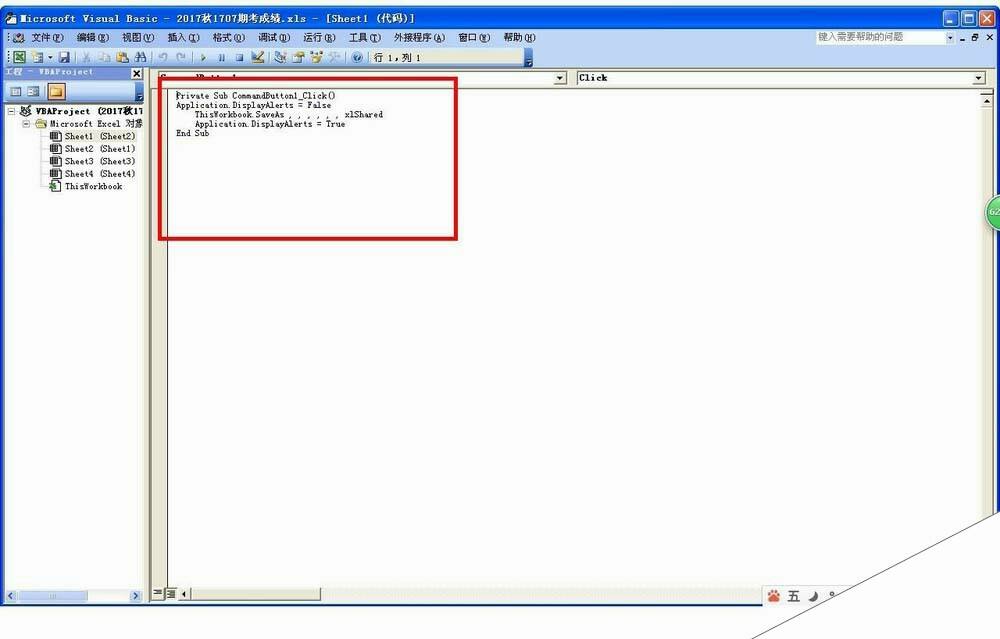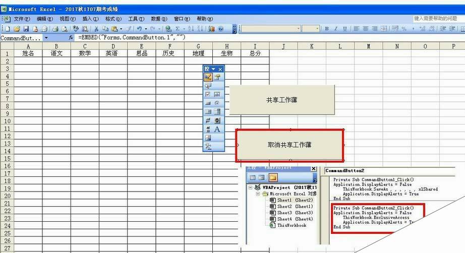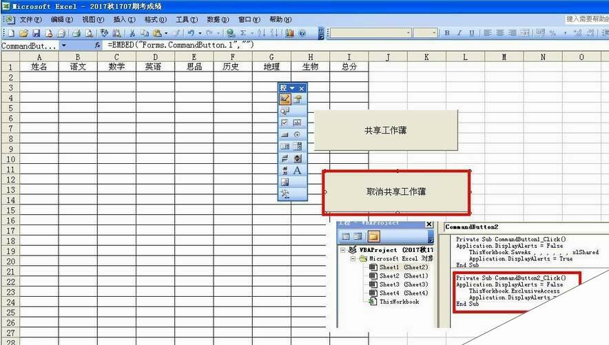 4、设置代码:右击共享工作薄的命令按钮——查看代码——然后在代码编辑区那里输入如下内容并保存退出: