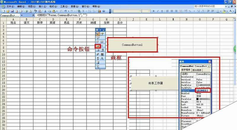 3、插入命令按钮并设置属性:点击选择命令按钮——在表格空白处画一个框,命令按钮就出来了——右击命令按钮,选择属性——把caption属性改为:共享工作薄。