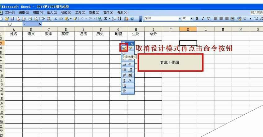 5、运行代码:回到共享工作蒲命令按钮那里,点击控件箱左上角的设计模式,取消设计模式,然后点击命令按钮就可以运行代码了,这时VBA编辑器就会被锁定无法进去。