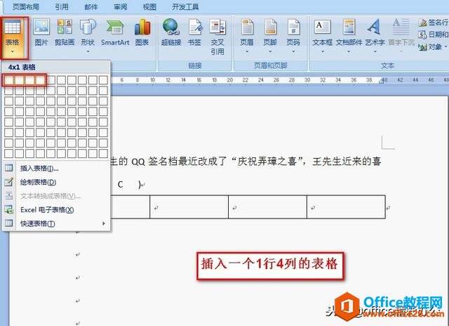 1、在word中选择题题干,然后插入一个1行4列的表格.