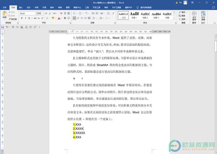 第一步:打开需要处理的Word文档可以看到其中的编号上有黄色的填充;