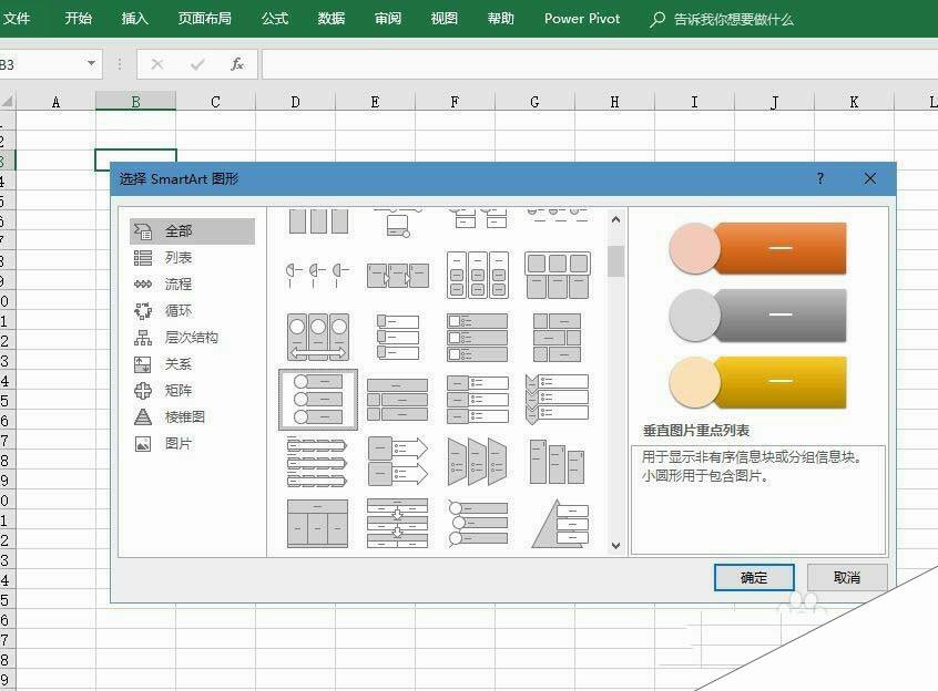 2、在弹出的SmartArt图形选择对话框中,选择右侧的“垂直图片重点列表”按钮,然后,点击“确认”按钮。