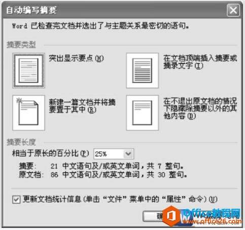3、选择一种摘要类型,并设置摘要长度,单击确定按钮完成自动编写摘要。