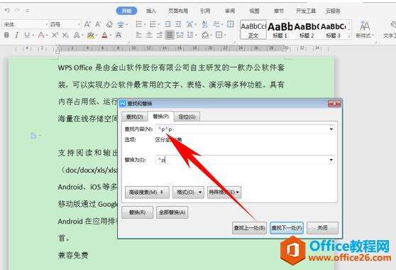 弹出查找与替换的对话框,单击替换,在查找内容处输入^p^p,然后在替换内容处输入^p,单击全部替换。