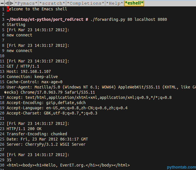 然后,我们在forwarding.py的输出结果中可以看到浏览器和webpy之间的通信内容。