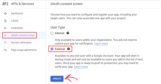 接下来,单击左侧菜单中的“OAuth同意屏幕”选项。这里你有两个选择。如果你有一个会员制网站或出售在线课程,并希望允许你的用户使用Google登录,那么“外部”选项是有意义的。“内部”选项只允许贵公司的用户登录Google。对于此选项,您需要有一个高级Google Workspace帐户,并且您的用户需要被添加为团队成员。