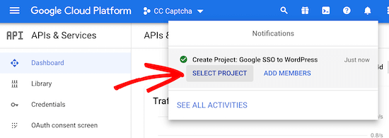 之后,点击“创建”按钮。创建项目后,会有一个下拉通知菜单显示您的新项目。单击“选择项目”按钮打开项目。